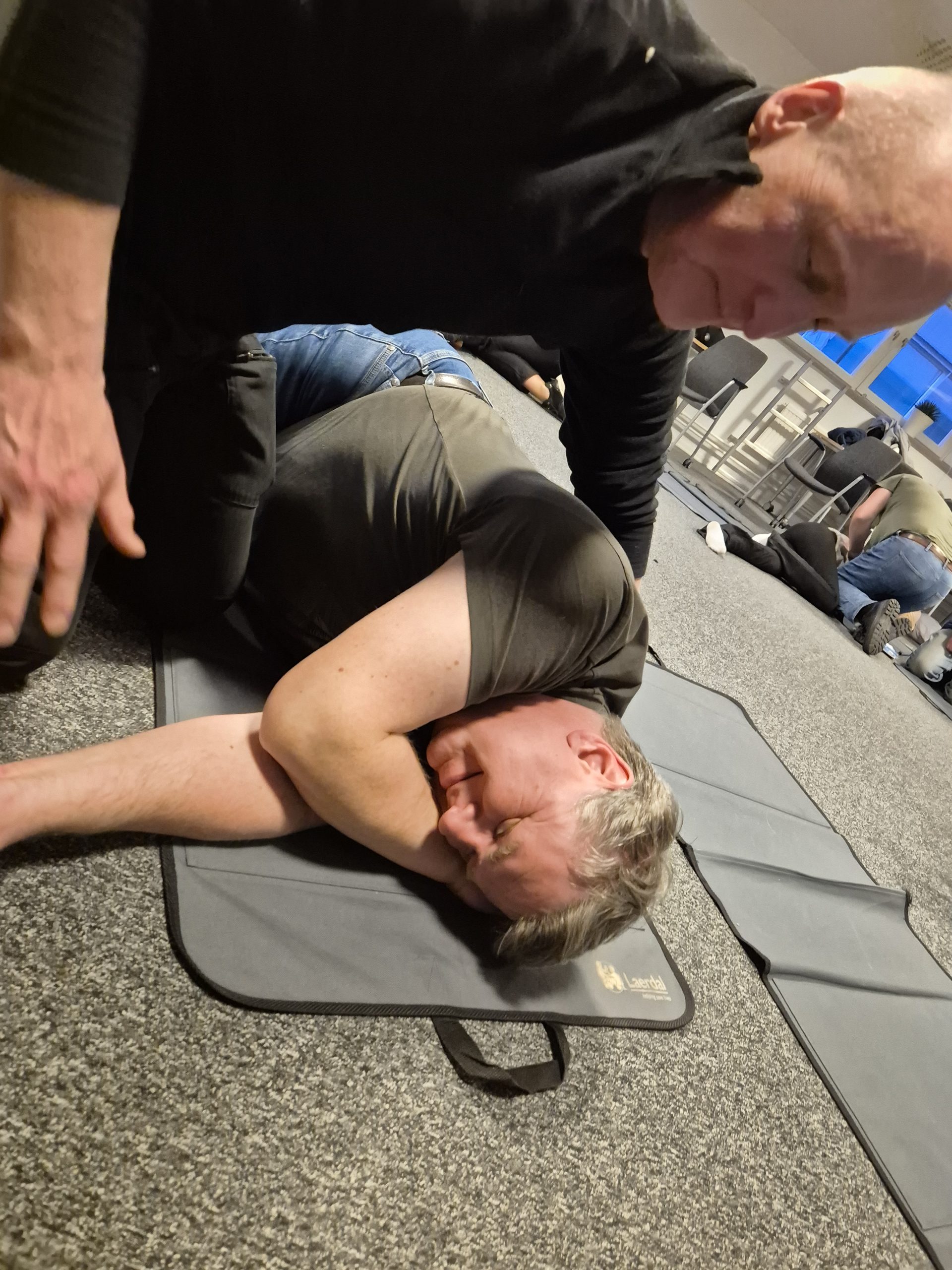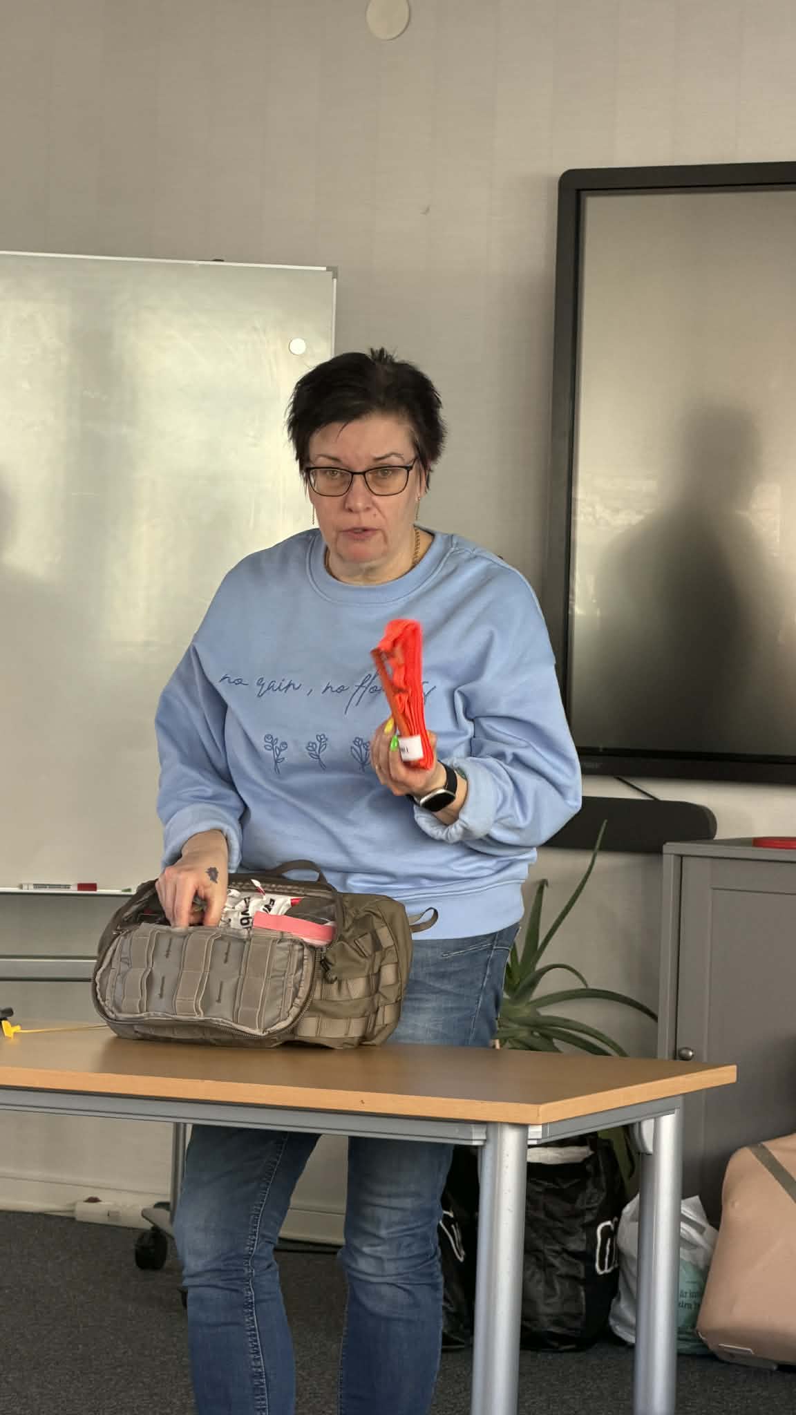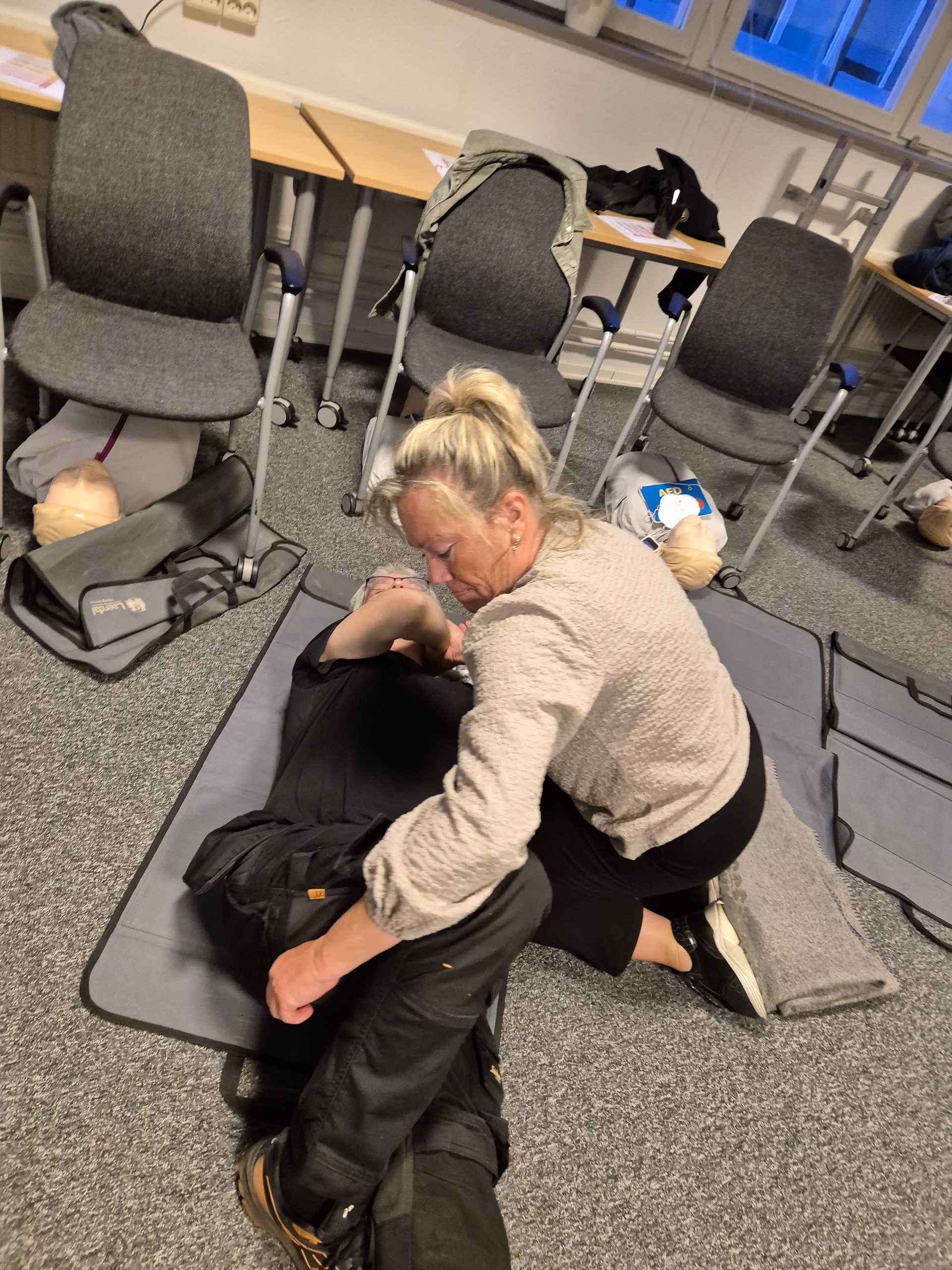 Under utbildningen fick vi naturligtvis öva på ”vanlig” HLR men också omhändertagande vid luftvägsstopp, lägga första förband, vi byggde militär sjukvårdsbår, övade på att få upp en medvetslös person på båren och hur du förflyttar någon på bår. Vi fick lära oss hur vi känner igen symtom på en Stroke, och hur viktigt det är att snabbt komma under vård – tid är hjärna! Vi gick igenom vad du ska tänka på när du kommer fram till en skadeplats och pratade om vikten av att i efterhand ta hand om de känslor som uppstår när man varit dela av en tuff situation. Katarina passade också på att visa de nya insatsväskor med sjukvårdsmaterial som Region Blekinge försett oss med, mer om dessa kommer i ett eget inlägg.