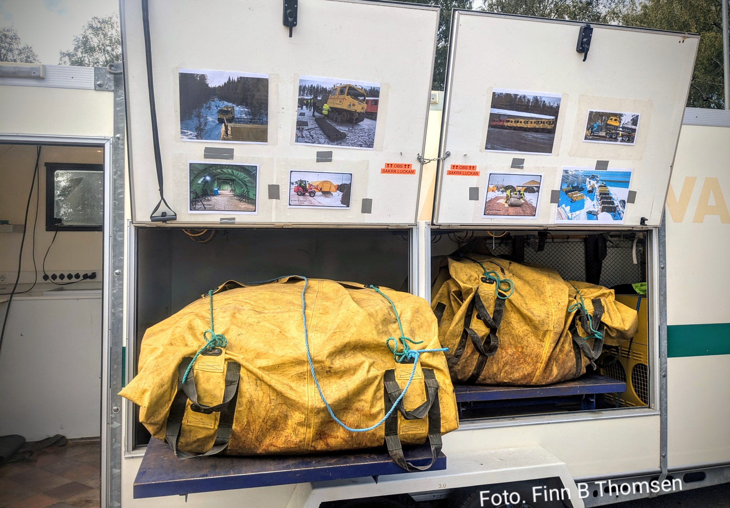Vi kunde då berätta om vagnens utrustning, den har två led/ diod belysningstolpar vi kan fälla upp på taket för att lysa upp hela insatsområdet, två uppblåsbara tält med värme och belysning, 27 bårar, droppställningar, litet stabskontor, lyftöglor på taket så släpet kan lyftas med kran eller helikopter m m.
